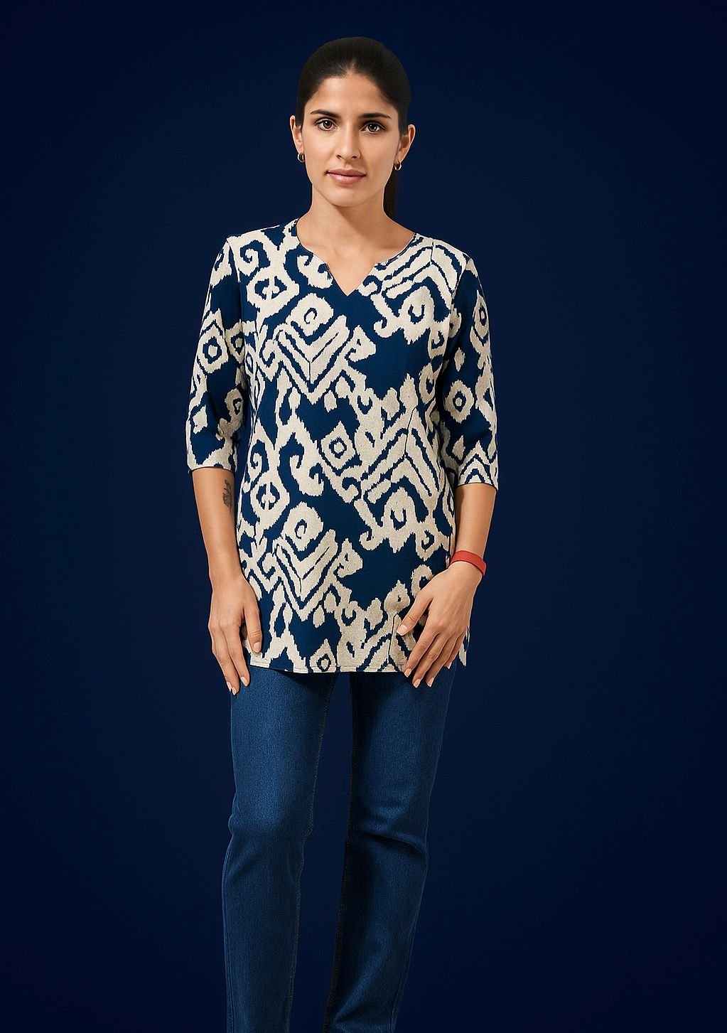 Embrace timeless elegance with the Vestaci Pure Cotton Navy Blue with White Printed Regular Sleeve Kurti. Made from breathable and soft pure cotton, this kurti ensures all-day comfort while keeping your style on point. The rich navy blue base with delicate white prints adds a graceful ethnic touch, while the regular sleeves make it versatile for daily wear. Ideal for office, casual outings, or festive occasions, it pairs beautifully with leggings, palazzos, or jeans for a complete look.
